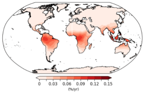 For example, the influence of humidity and UV radiation has been simulated to quantify photo-degradation globally (figure 2). The regions with high UV and humidity have moderate to high degradation rates. With our advanced modelling approach, we can estimate the regions more likely to be susceptible to a specific degradation mode and provide solutions to the solar farm operators and manufacturers to improve the module lifetime.