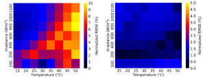 In contrast, our adjusted model provided a precise fit for the entire I-V curve under all potential operating conditions. Figure 9 demonstrates the root-mean-square-error values for both the standard single-diode model (left) when accurately predicting maximum power and our adjusted model (right), showing a significant improvement in overall prediction accuracy.